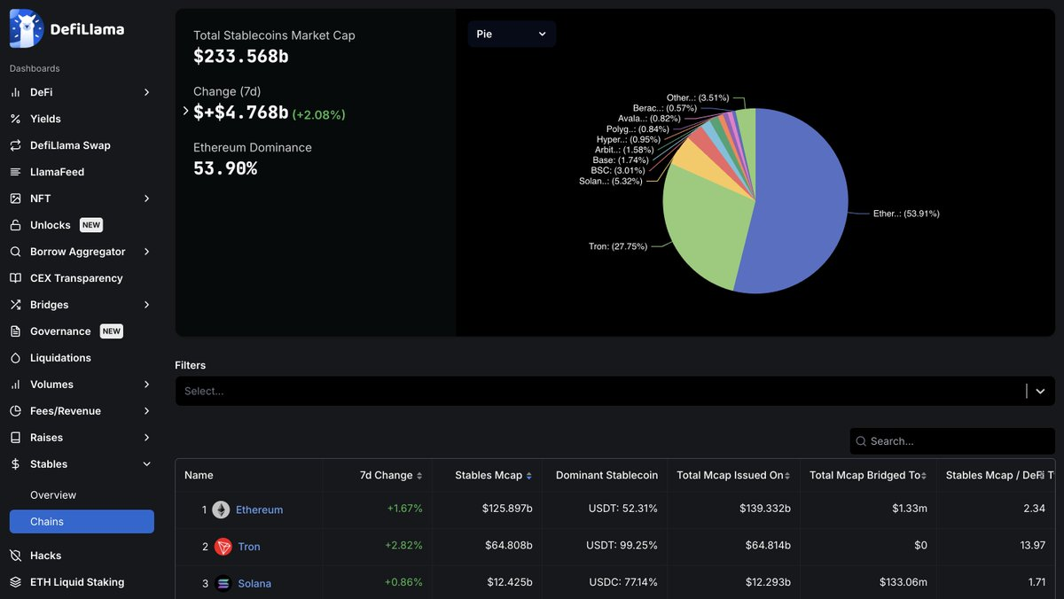 По данным DefiLlama, на сегодня лидеры по объёму стейблкоинов — это Ethereum и Tron.