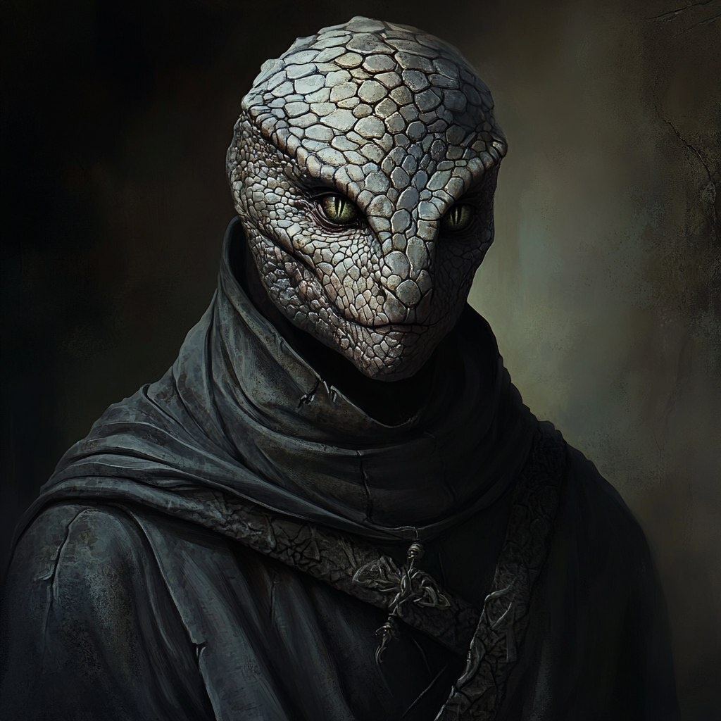 Автоперевод: Портрет мужчины, змеиные глаза, чешуйчатая кожа, одеяние, стиль DND, фэнтезийная обстановка
