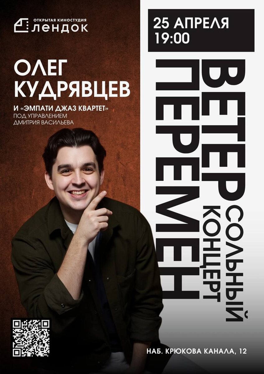 Пока мы в такой хорошей компании тут, у меня вот есть объявление У моего друга и коллеги Олега Кудрявцева важное событие - сольный концерт. Этот концерт — про музыку, искренность и живые эмоции. В этот вечер я исполню песни, которые близки мне и, возможно, найдут отклик в ваших сердцах. И если вам нужен рецепт хорошего вечера, то ссылка на билеты ниже. 📅 25 апреля в 19:00 📍 Открытая киностудия «Лендок» (Набережная Крюкова канала, 12) 🎟 Билеты доступны по ссылке: https://kudriavtsev-on.timepad.ru/event/3227685/ (количество ограничено) До встречи! 🎤✨