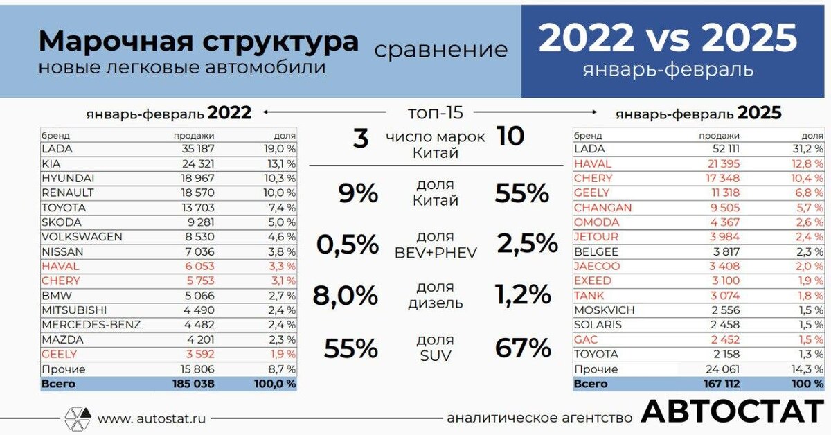 Lada, Китай и Toyota — так выглядит топ-15 брендов новых легковых авто в России в 2025 году. В сравнении с 2022 годом, из топа полностью исчезли KIA, Hyundai, Renault, Skoda, VW, Nissan, BWM, Mitsubishi, Mercedes и Mazda. Lada увеличила долю с 19 до 31.2%, а также в топе появились новые «Москвичи» и 2.5 тысячи Solaris, которые собрали (https://t.me/rbtshki/16003) из «неосвоенных комплектов» на бывшем заводе Hyundai.