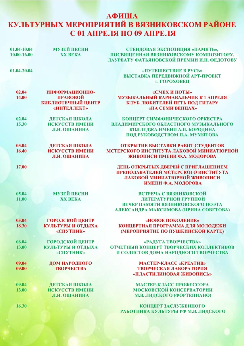 ✅ Афиша культурных мероприятий в Вязниковском районе с 1 апреля по 9 апреля