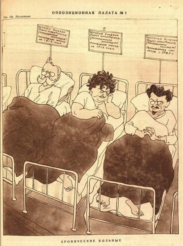 (Над кроватью Каменева написано «История болезни. Febris oppositionica. (Оппозиционная лихорадка). Осложнение припадка 1917 года». Точно та же надпись красуется и над изголовьем Зиновьева. А у Троцкого немного иначе: «История болезни. Febris oppositionica. (Оппозиционная лихорадка). Перманентные приступы с 1923 г.».) Троцкий был и оставался меньшевиком до конца жизни, как и Хрущёв. Был активным членом февральской революции и поддерживал временное правительство. После победы Октябрьской Революции он просил Ленина, чтобы его приняли в партию большевиков. Ленин поверил ему и согласился! Естественно, он нанёс большой ущерб для партии большевиков: устранял и расстреливал активных её членов (ввёл расстрельные тройки, чтобы на месте расстреливать «врагов» без суда), вёл работу по смене идеологии партии - создал фундамент превращения большевистской партии в меньшевистскую! А теперь представьте себе, как тяжело было Сталину восстановить ленинскую партию – партию большевиков и строительства мате