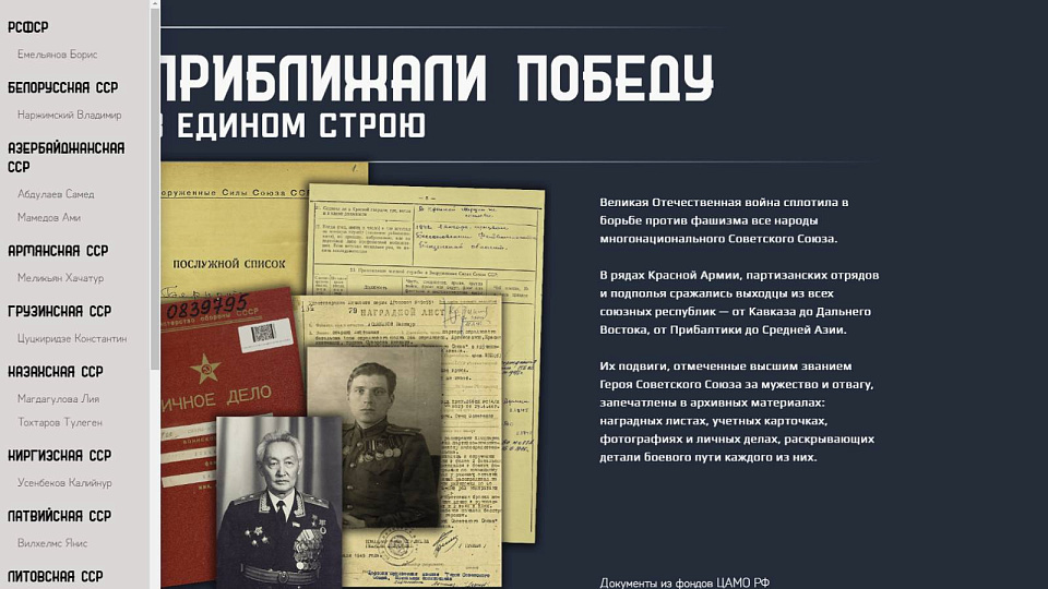 Советского Союза. Проект создан на основе рассекреченных документов из фондов Центрального архива ведомства, ранее недоступных широкой общественности - наградных листов, учётных карточек, фотографий и личных дел. Эти материалы раскрывают неизвестные страницы биографий героев и их боевые подвиги. Среди героев проекта – представители разных национальностей и республик Советского Союза: России, Белоруссии, Азербайджана, Армении, Грузии, Казахстана, Киргизии, Латвии, Литвы, Таджикистана, Туркменистана, Узбекистана, Украины и Эстонии. - Их судьбы – это пример мужества, самоотверженности и преданности Родине, которые вдохновляют новые поколения, - уверены в Минобороны России. Проект посвящён 80-летию Победы советского народа в Великой Отечественной войне. Иван Ветров Фото — heroes80.mil.ru Дата публикац