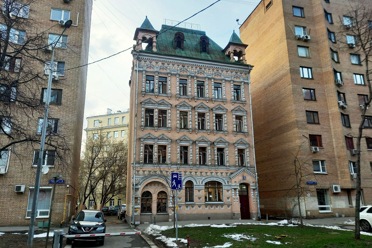 Начнем мы сегодняшнюю прогулку с одного из самых ярких и в то же время наименее растиражированных столичных зданий в русском стиле. Речь о доходном доме Титова в Ружейном переулке, единственном сохранившемся здесь дореволюционном здании, ныне буквально зажатом кирпичными девятиэтажками 1970-х годов. За свой нарядный облик и богато декорированный фасад это здание 1914 года постройки получило свое наиболее известное неофициальное название – «Пряничный домик». Строение и впрямь изобилует всевозможными украшениями и «архитектурными излишествами», включая арки и колонны, наличники и кокошники, шатровую крышу и две декоративные башенки по бокам. Недаром несколько лет тому назад это изящное здание наконец-то обрело заслуженный статус объекта культурного наследия регионального значения.