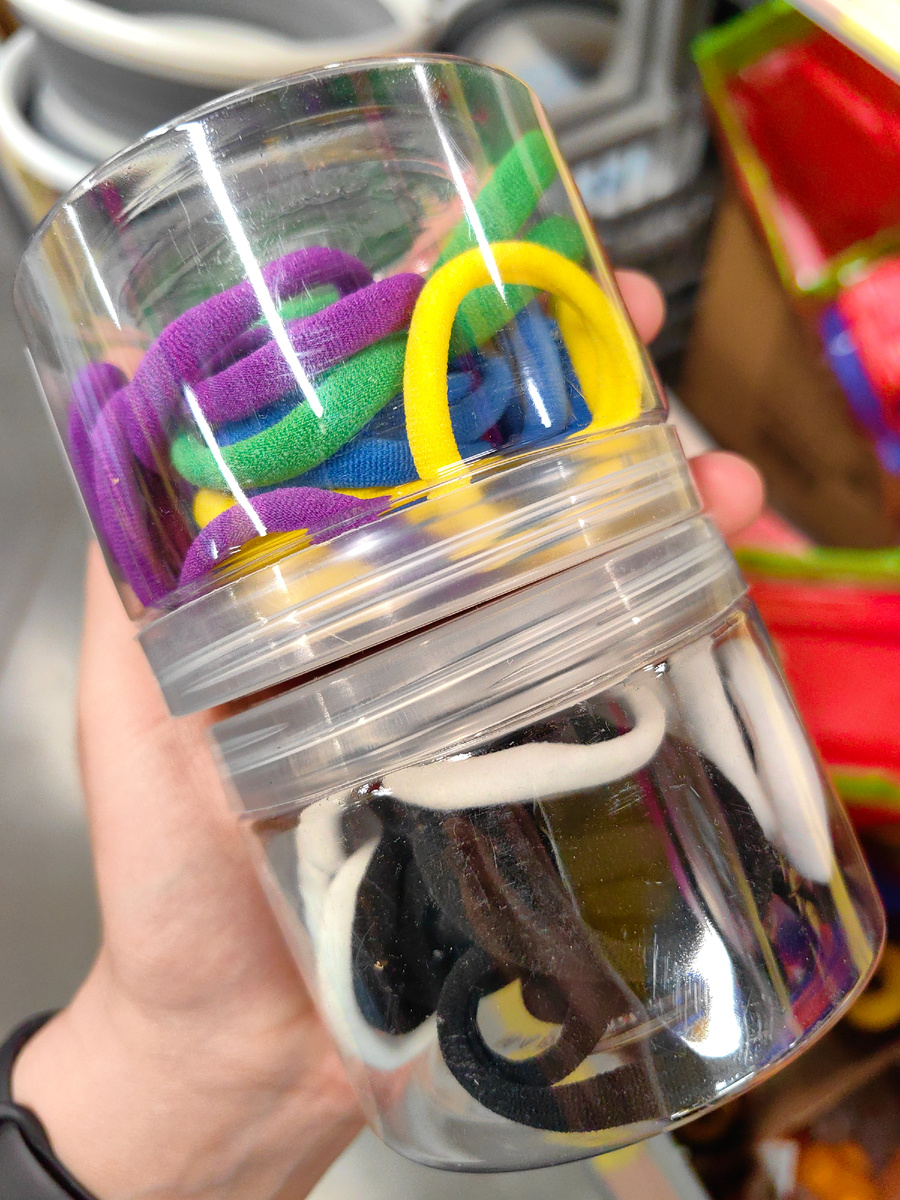 Всего 30 штук, либо цветные, микс, либо черные и белые, кому какие нужны. Не скажу, что резинки для прически крошечные. Даже диаметр на банке указан, без растяжки 4,5 см.
