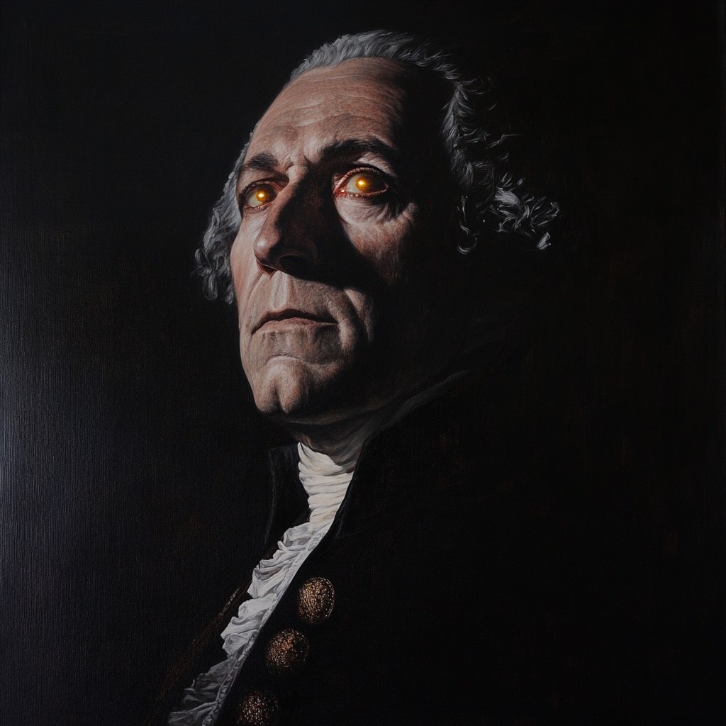 Создано на основе запроса: Portrait of George Washington standing in the shadows, eyes glowing ominously, surrounded by darkness, villainous expression, eerie and mysterious atmosphere, oil painting style, historical realism, ultra-detailed
