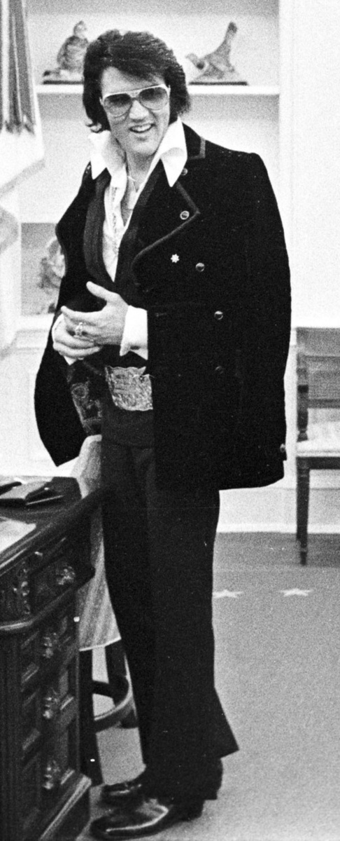 Один из исторических пиджаков был создан Биллом Белью для визита Пресли в Белый дом в 1972-м. Бархатный бушлат с золотыми пуговицами и лацканами, серьезно превосходящими лацканы президентского пиджака, был не по протоколу накинут на плечи, дополнен рубашкой с воротником-стойкой, а также ремнем, пряжка которого была размером с голову Никсона.