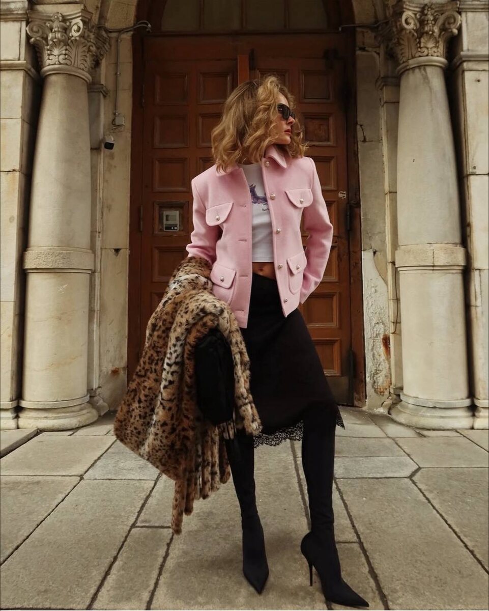 Если не хотите выглядеть слишком разряженно-женственно(популярный запрос, хотя я в этом проблемы не вижу), добавьте сверху что-то из мужского гардероба. Бомбер, тренч, поло, футболка или лонгслив уравновесят мощный заряд юбочной феминности.