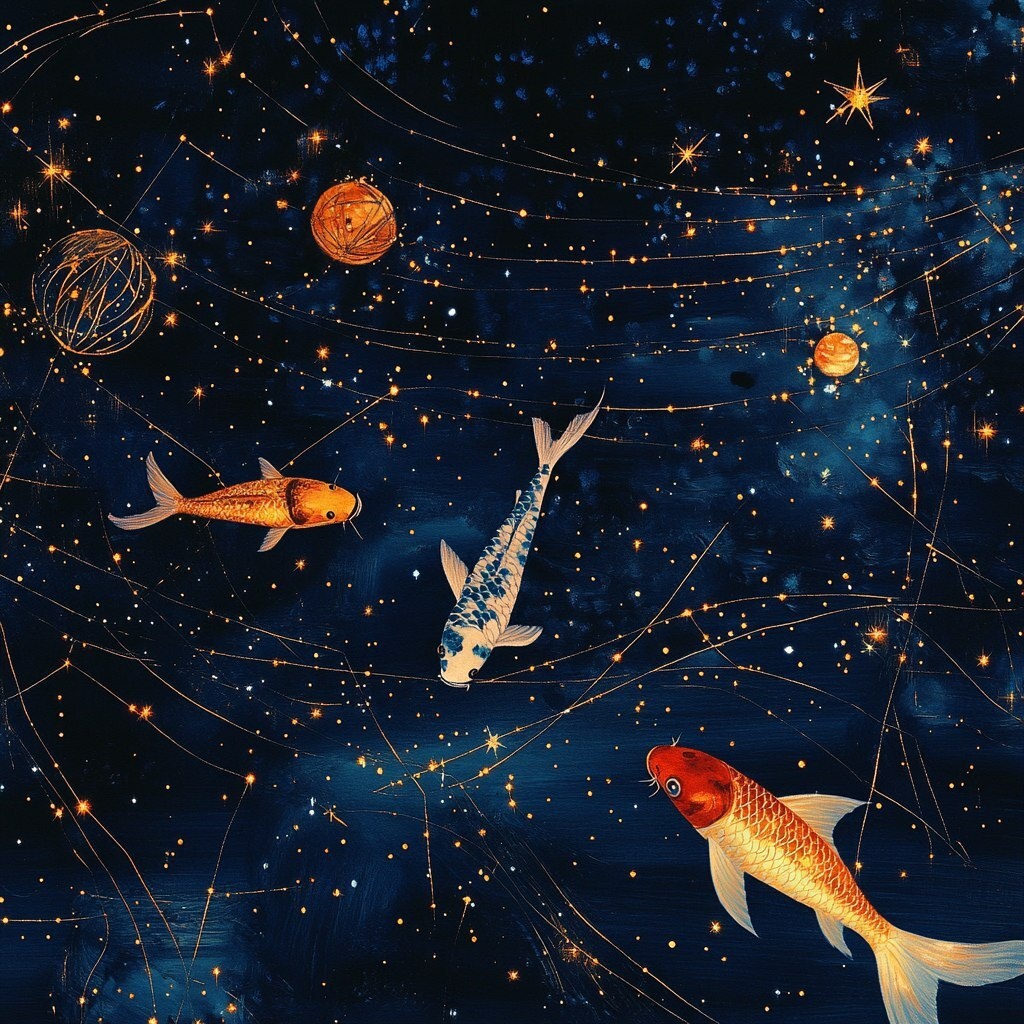 Создано на основе запроса: a large starry night with different planets on it, the stars are formed by tiny Chinese Koi fishes