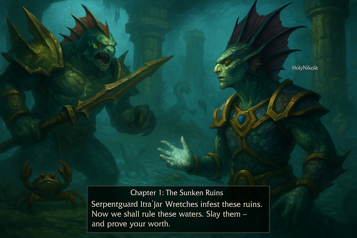 (Книга по мотивам World of Warcraft 3.3.5a) Пролог: Начало Путешествия Глубоко под волнами, в затенённых расщелинах Водного Царства, раскинулся величественный город Наг. Величественные коралловые башни вздымались к самой поверхности океана, а жемчужные купола переливались под мягким светом луны, проникавшим сквозь толщу воды. Здесь, среди древних реликвий и сокрытых от глаз тайн, начиналась история юного наг-жреца. Его звали СвятойНикола. Боевой жрец, последователь своего бога, имя которого он не знал — не потому, что его не существовало, а потому, что сам Никола ещё не удосужился его придумать. Впрочем, это не мешало ему ревностно верить и с уверенностью проповедовать его волю, несмотря на некоторые… разночтения в священных текстах. Главное — звучало внушительно. С детства он ощущал связь с энергиями глубин, но сердце его жаждало не только изучения религиозных догм, но и чего-то более… весомого. Например, молота. Или хотя бы посоха с металлическими наконечниками. "Вера — это прекрасно