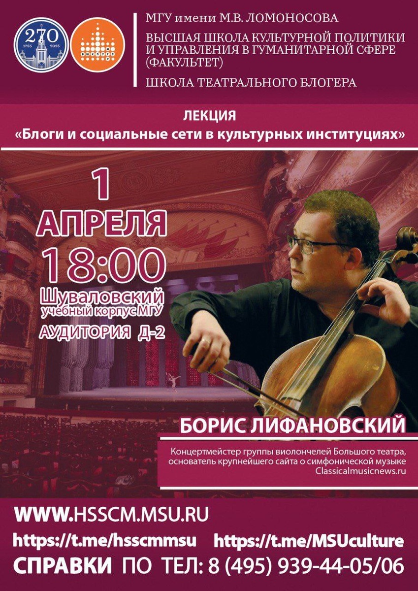 Новая встреча «Школы театрального блогера». Лекция на тему «Блоги и социальные сети в культурных институциях» состоится в рамках проекта Высшей школы культурной политики и управления в гуманитарной сфере (факультета) МГУ имени М. В. Ломоносова и Театра имени Натальи Сац «Школа театрального блогера» 1 апреля в 18:00 в аудитории Д-2 Шуваловского учебного корпуса МГУ. Лектор - Борис Игоревич Лифановский, концертмейстер группы виолончелей оркестра Большого театра, создатель крупнейшего сайта об академической музыке ClassicalMusicNews.Ru. Хотите знать больше о практических навыках взаимоотношения с ресурсами соцсетей и услышать компетентное мнение о том, какие блоги о культуре самые рейтинговые и квалифицированные? Приходите! Будет интересно, а также полезно.