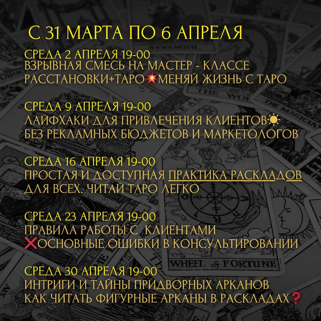 ❗️ГОРЯЧИЕ ТЕМЫ АПРЕЛЯ 🔥 Что вам не расскажут на курсах по ТАРО Дорогие, подготовила расписание мероприятий на этот месяц🙌🏻 Каждую среду, в 19 мск вас ждут невероятные уроки по Таро и не только😉 Все Эфиры пройдут здесь 👇👇👇👇👇👇👇👇 ✈️ Телеграм Обучения