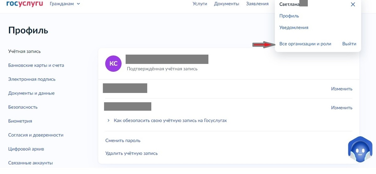 Итак разберемся. Для регистрации вам понадобится только подтвержденная учетная запись директора-физического лица и электронная подпись юридического лица (как правило хранится на флешке-рутокене). Заходим в госуслуги под данной учетной записью, в правом верхнем углу нажимаем на иконку профиля и выбираем "Все организации и роли".
