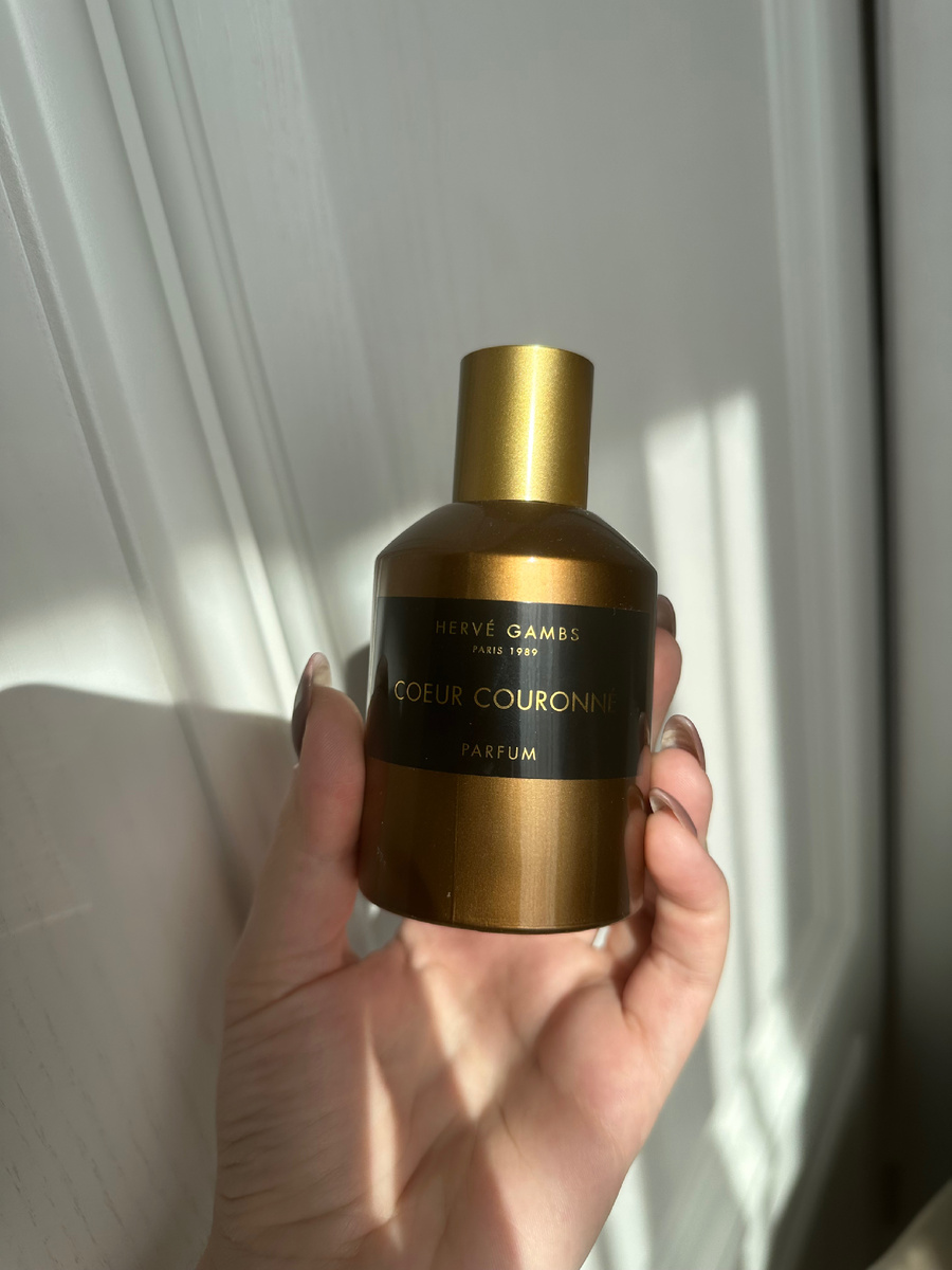 Этот аромат переодически появляется в моих подборках и вот кажется пора посвятить ему отдельный обзор. Сегодня речь пойдет про аромат с действительно прекрасным шлейфом и необычным переливистым звучанием - HERVE GAMBS PARIS Coeur Couronne. Этот аромат, настоящая парфюмерная редкость, был выпущен в 2013 году и относится к группе восточные, цветочные. Верхние ноты: нероли, роза, жасмин Средние ноты: полынь Базовые ноты: карамель, ваниль Этот аромат настоящая парфюмерная загадка, потому что пирамида в корне не соответствует звучанию. Вот смотришь пирамиду и думаешь, что это что-то сладко цветочное с легкой терпкостью, а на деле получаешь аромат табака, сухофруктов и чёрного чая. Загадка? Однозначно, да! Теперь подробнее, аромат на коже стартует кальянным табаком с сухофруктами, таким влажным в густом сиропе. Очень необычно и странно. Далее он начинает постепенно раскрываться в крепкий черный чай с дымком, при этом легкая фруктовая нотка все же остается. База из ванили и карамели дает