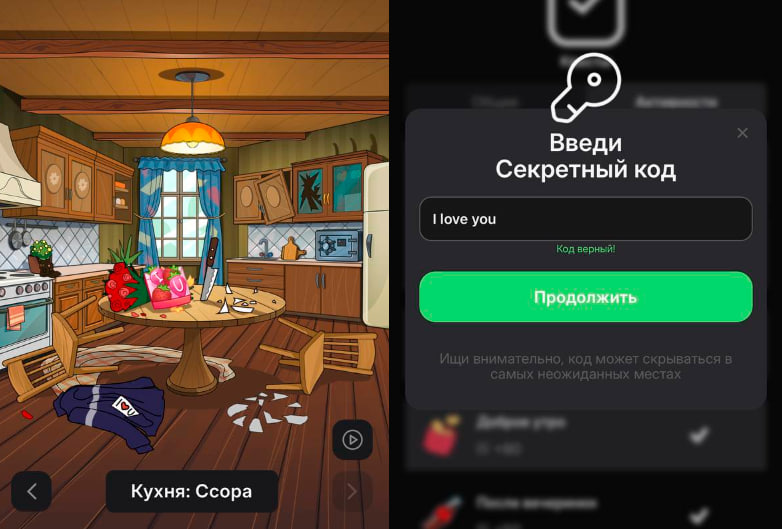 Код на задание "Ссора" - I love you. Вводить в разделе активности. Чтобы увидеть код, необходимо решить ребус, с помощью подсказок на картинках. Чтобы задание засчитали необходимо пригласить еще поставить лайк и сделать репост поста в телеграмме