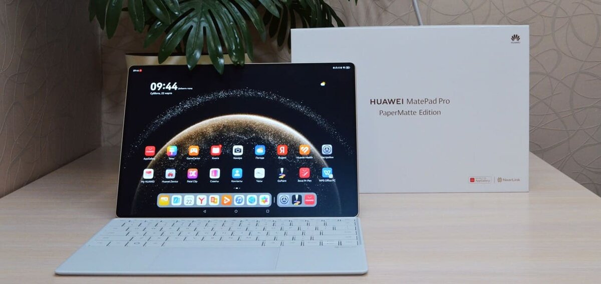 На данный момент у Huawei самым крутым планшетом является MatePad Pro 13,2″. Насколько нам известно, это самый большой планшет в мире. Правда айпады почти такие же, но всё же на 0,2″ меньше. Так что в этом плане лидерство за Huawei. MatePad Pro 13,2″ выпускается в двух версиях. В чёрном цвете с OLED-дисплеем FullView и в золотом с OLED-дисплеем PaperMatte. Оба варианта поставляются с клавиатурой. Мы же сегодня расскажем о своём впечатлении от золотой версии. Планшет выглядит очень изыскано, впрочем как всегда. Huawei не позволяет себе делать дорогие вещи «на отвали». Если они за что-то и просят большие деньги, то это однозначно приятно держать в руках. Планшет не просто тупо золотой, а как будто не прокрашен, что делает его гораздо дороже внешне. О компактности тут конечно речи не идёт. MatePad Pro 13,2″ сделан для тех, кому нужен большой гаджет. А вот толщина у него всего 5,5 мм (без учёта камеры), что конечно впечатляет. Весит планшет 580 грамм. Размер и вес не изменились по сравнени
