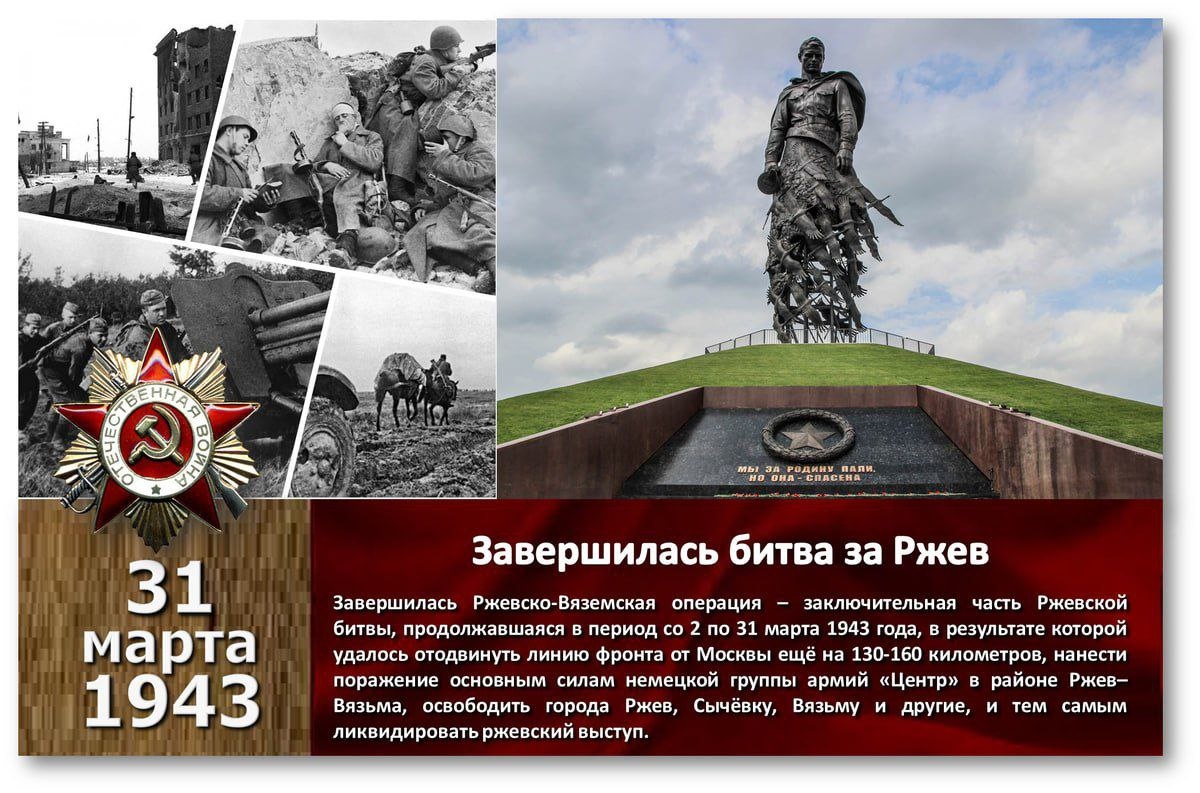 31 марта 1943 года завершилась Ржевская битва, которая является одной из самых кровопролитных битв Великой Отечественной войны.