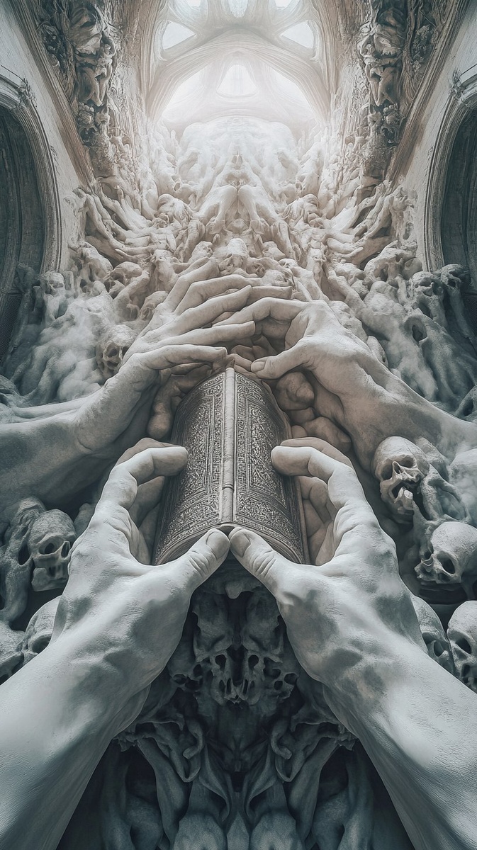 Создано на основе запроса: A huge, surrealistic, and intricate sculpture of many hands holding the dark, sacred book surrounded by fog in an ancient cathedral. The sculpture is made of white marble and has a fantasy style, in the style of Greg Rutkowski. This is a digital art piece, in the style of Zdzisław Beksiński, in the style of Daniel Merriam, in the style of Simon Bisley, in the style of Francisco Goya, and in the style of Claire Droppert.