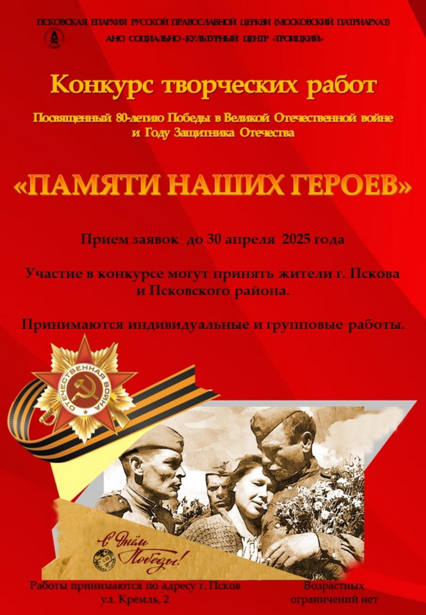 В рамках фестиваля "Памяти наших героев", который состоится 9 мая 2025 года на территории Свято-Троицкого кафедрального собора города Пскова, объявляется конкурс творческих работ, посвященный 80-летию Победы в Великой Отечественной войне и Году защитника Отечества.