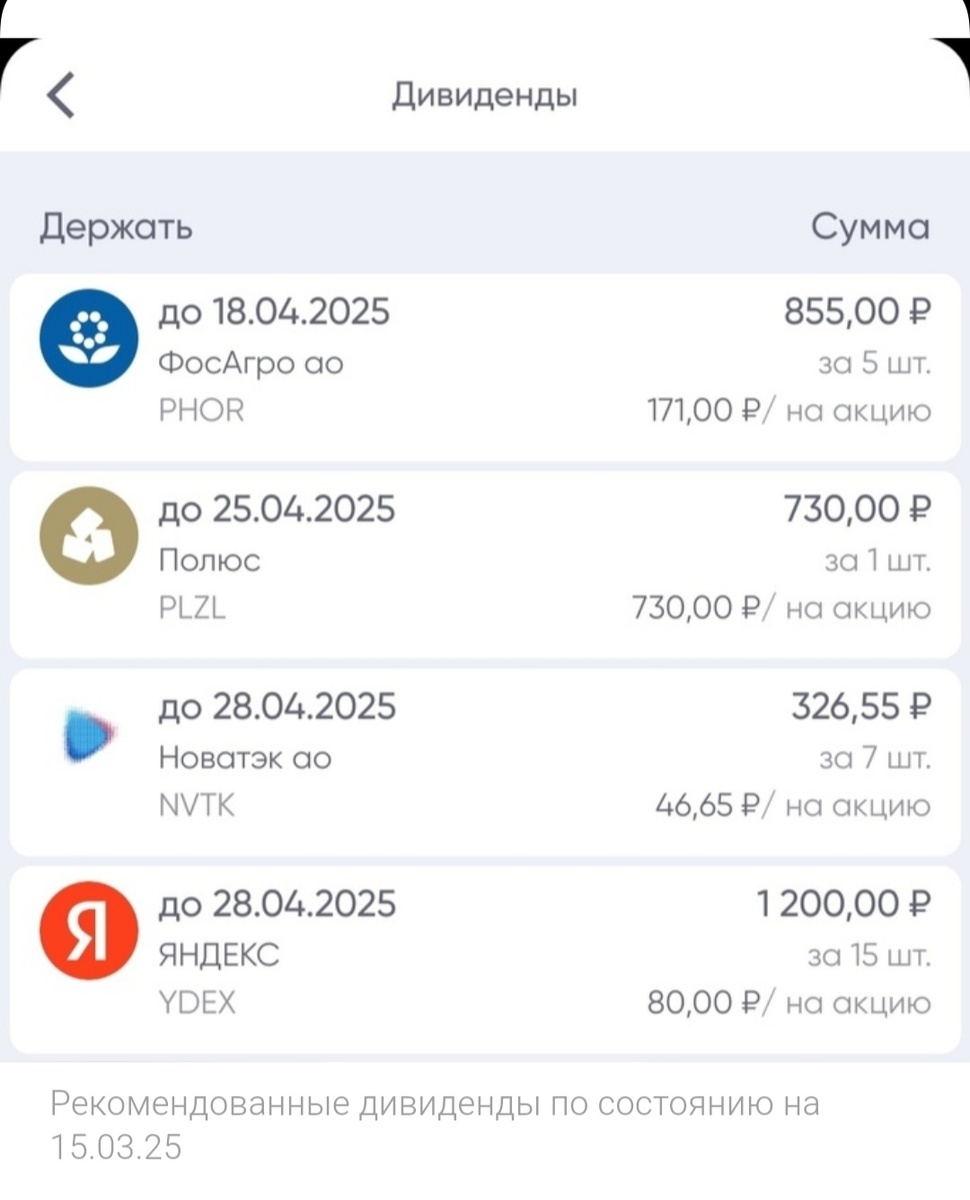 Всем привет! На улице запахло весной, а это значит, что на нашем фондовом рынке запахло дивидендами💰. Компании продолжают публиковать отчетности за 2024 год и рекомендовать дивиденды. Весенний сезон приближается, и он самый крупный по размерам дивидендов в году. Основная волна выплат приходится на апрель–июль. Рекордов в этом году, конечно, вряд ли увидим, но некоторые компании выплатят разовые спецдивиденды. Например, Х5 Group («Пятерочка»). Получать дивиденды от компаний на брокерский счёт или на карту в виде денежных средств – это приятно, думаю, многие инвесторы со мной согласятся. Недавно я уже рассматривал рекомендации по дивидендам в своём портфеле по состоянию на 15.03.25. На тот момент картина выглядела следующим образом 👇 Прошла половина месяца и пора обновить данные по рекомендованным дивидендам, база значительно выросла, относительно прошлого обзора. Если в середине марта общая сумма рекомендованных дивидендов составляла ~ 3 111 руб. (до вычета налогов). То на се
