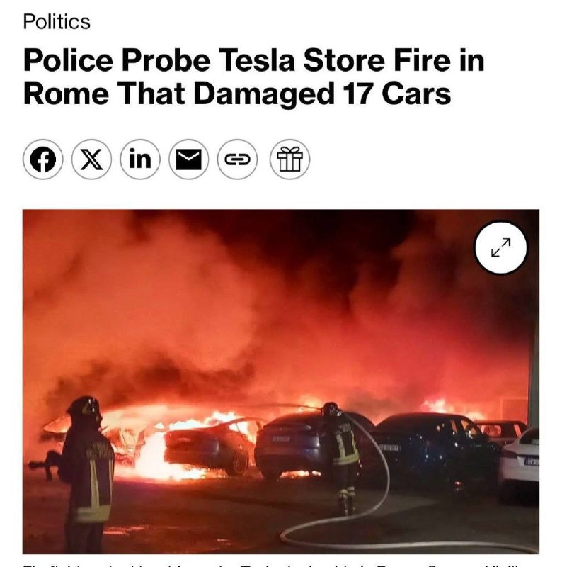 В Риме террористы по зову демократов сожгли 17 машин Tesla.