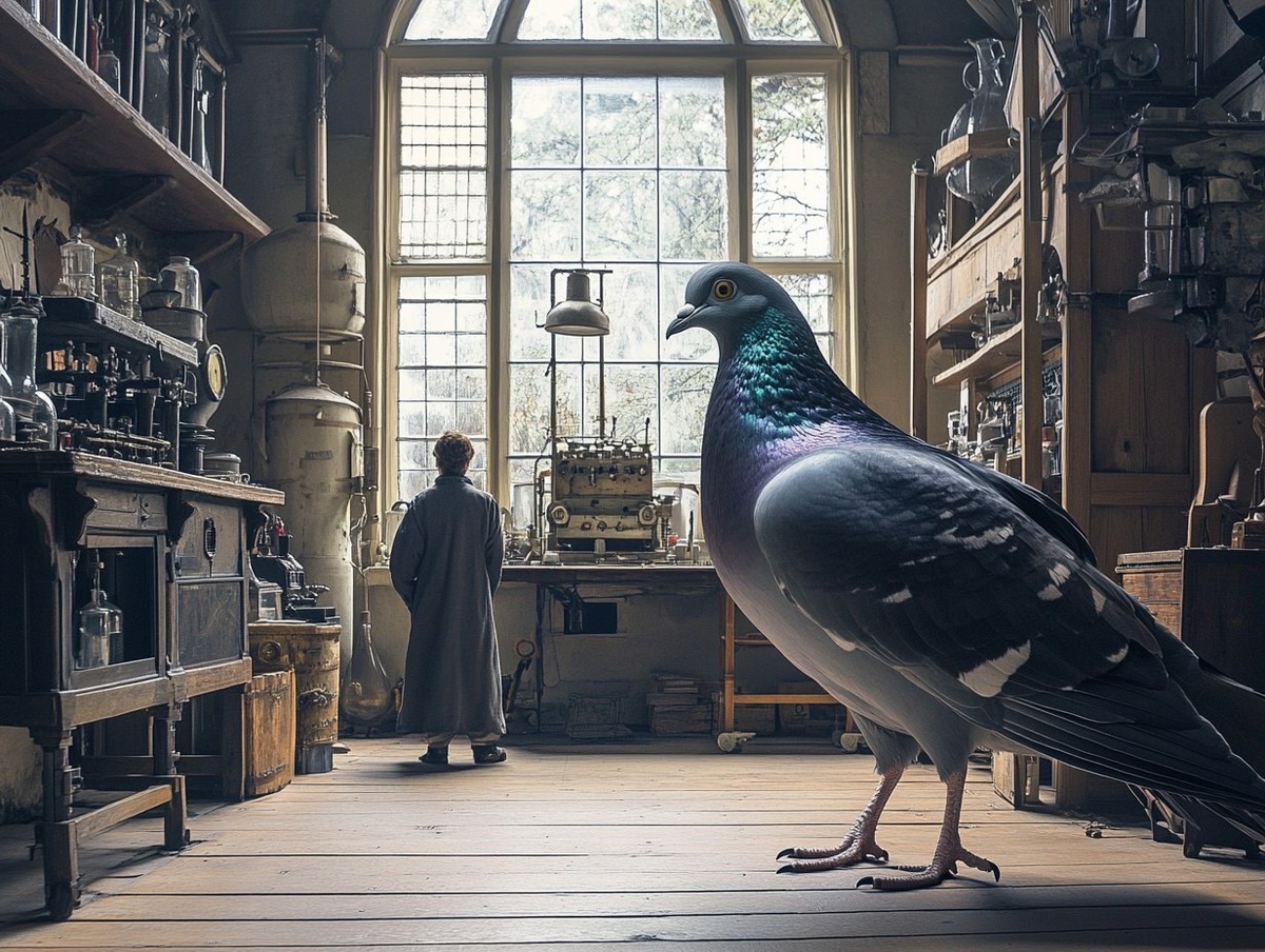 Создано на основе запроса: A brightly lit photograph of 8 foot tall pigeon next to a smaller person in a fourteenth century scientific laboratory. The person is a scientist. There is laboratory equipment in the background. There is a large window on the back walk letting in sunlight. Sony A65 camera.