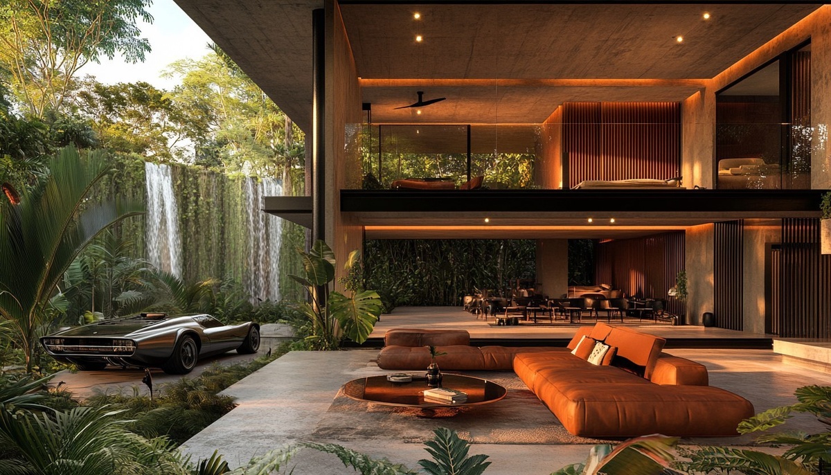 Создано на основе запроса: brazilian lounge in a luxury brutalist house in the amazonian jungle, with corten details and leather furniture