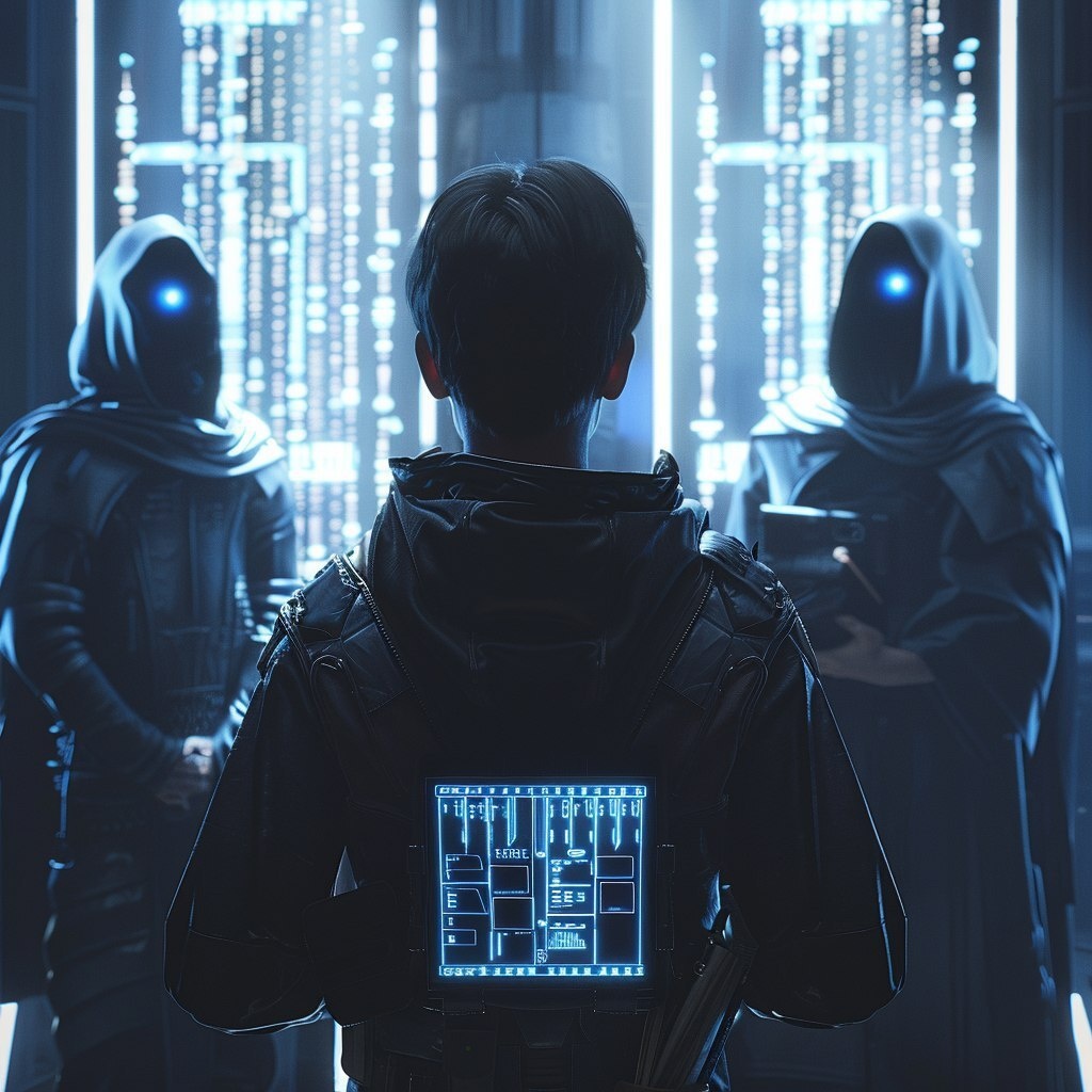 Создано на основе запроса: a young male explorer in a navy-blue futuristic outfit, standing in the foreground with his back to the viewer, holding a digital notebook. In the background, three mysterious figures in dark hooded robes stand facing him, looking toward the camera. The scene is inside a high-tech chamber with glowing holographic screens showing linguistic symbols. Dramatic backlighting, cinematic framing, over-the-shoulder perspective, symmetrical composition, sci-fi comic book style, cel-shaded, sharp line art --- Автоперевод: Молодой мужчина-исследователь в военно-морском голубом футуристическом наряде, стоящий на переднем плане спиной к зрителю, держащий цифровой ноутбук. Неплохо выглядит? 🤔 https://dzen.ru/id/65c0c65c86e4f837c27b24d7 #ИИ #AI #нейросеть #midjourney #art