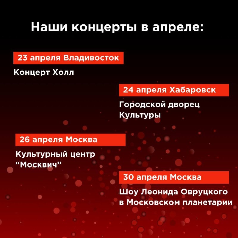 С радостью сообщаем вам о наших предстоящих концертах в апреле! Мы, Леонид Овруцкий и группа Кватро, готовимся к незабываемым вечерам в трех замечательных городах: Владивостоке, Хабаровске и Москве! В Москве запланировано сразу две встречи: концерт группы Кватро и удивительное шоу Леонида Овруцкого! 📍 Владивосток, Концерт Холл 📅 Дата: 23 апреля 🕖 Время: 19:00 🎫 Билеты: https://clck.ru/3HGUXD 📍 Хабаровск, Городской дворец культуры 📅 Дата: 24 апреля 🕖 Время: 19:00 🎫 Билеты: https://clck.ru/3GvMiS 📍 Москва, Культурный центр «Москвич» 📅 Дата: 26 апреля 🕖 Время: 19:00 🎫 Билеты: https://clck.ru/3Gnoa7 Шоу Леонида Овруцкого «Всё начинается с тебя» 📍 Москва, Московский Планетарий 📅 Дата: 30 апреля 🕖 Время: 19:00 🎫 Билеты: https://clck.ru/3HQrnk Мы очень ждем встречи с вами и готовы подарить вам незабываемые моменты! Не пропустите наши концерты – это будет настоящая музыкальная феерия! 🎉