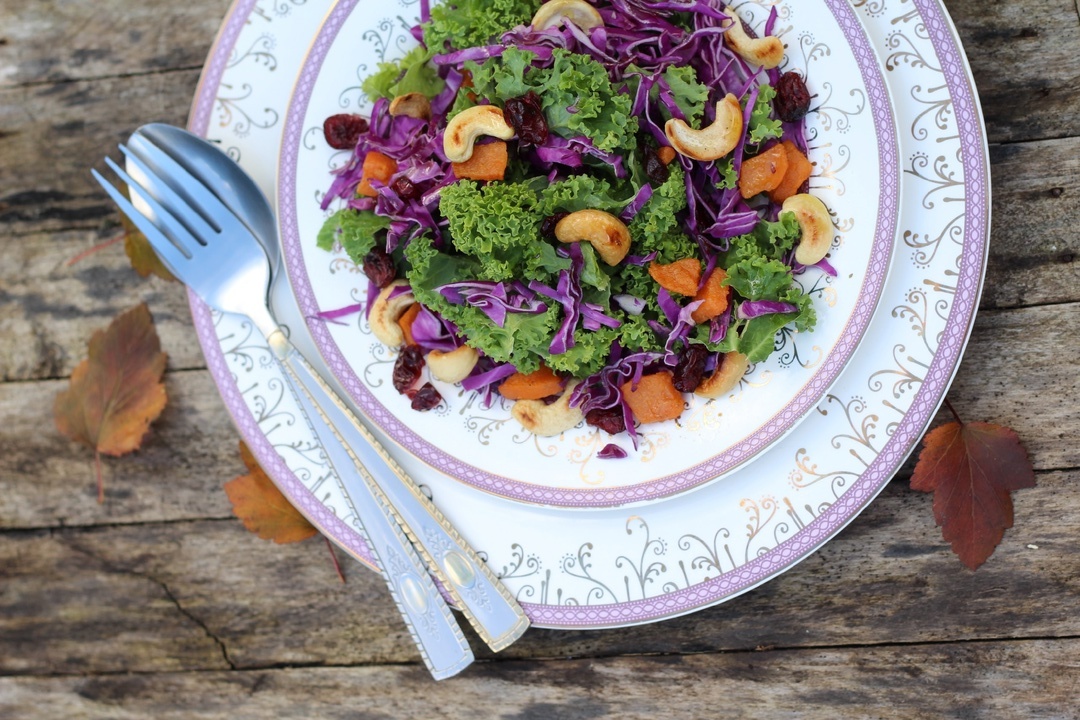 Перед тем, как опубликовать рецепт, хочу сказать, что он действительно стоящий. Что не маловажно - без пресловутого майонеза. И теперь мне постоянно нужна кейл! В салат добавила ещё одну свою любимую капусту, краснокочанную, Калибос. Люблю её, потому что это тот редкий случай, когда краснокочанная капуста нежная.