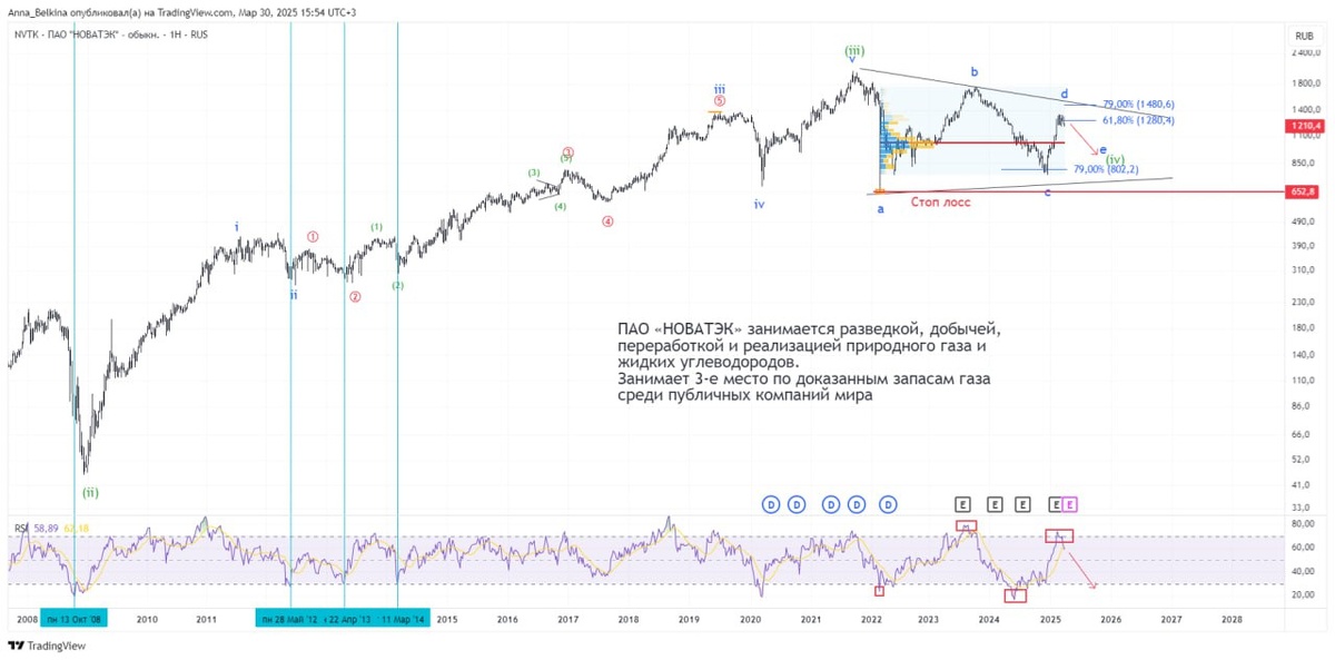 Из рассмотренного в видео: Тема – продолжение снижения российского рынка акций и облигаций, локальный откат рубля. https://dzen.ru/media/id/65b8789ff12bfe0796a26941/video-67ea2e1f5ecd6d61ec38f7f6 #нефтяники #NVTK Акции компании Новатэк движутся согласно ожиданиям – при достижении ценой уровней завершения волны (c) of iv треугольника отмечала дальнейший разворот в пользу роста в волне (d) of iv треугольника (поиск разметок по хештегу). Соответственно, сейчас полагаю завершение восходящего движения в волне (d) of iv. Далее последует снижение в последней пятой волне треугольника - (е) of iv. Поскольку треугольник имеет большую амплитуду движения, то думаю волна (е) of iv может быть глубокой, поэтому имеет смысл фиксации профита по бумаге и отслеживание её подбора по завершению волны (е) с удержанием в долгосрочной перспективе. Не является ИИР