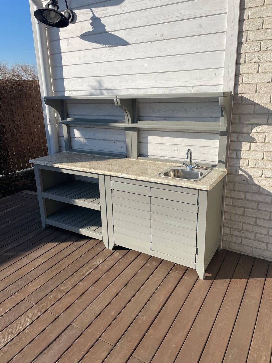 Спустя пару лет сфотографировал уличную кухню, которую сделал из сосны и покрасил уличной двухкомпонентной ПУ эмалью