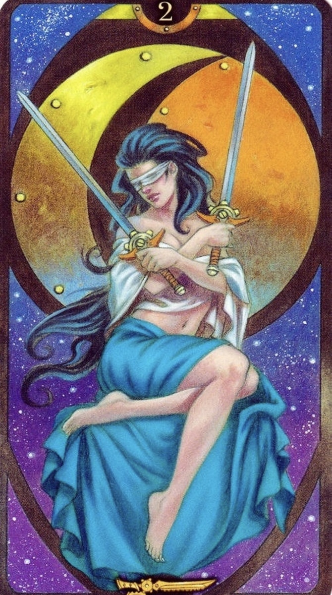 Двойка Мечей чаще всего ассоциируется с терпением и стойкостью при наступлении затруднительного положения. Карта говорит, что в предстоящем месяце всплывут какие-то нерешённые проблемы, которые потребуют от вас упорства и выдержки чтобы снизить их накал и не позволить перейти в терминальную стадию. Карта не сообщает каким образом лучше поступить, она лишь советует не проявлять нерешительность и излишние эмоции, а тщательно всё анализировать и поступать в соответствии с обстоятельствами. Впрочем, затруднения не будут долгими и благополучно разрешатся.