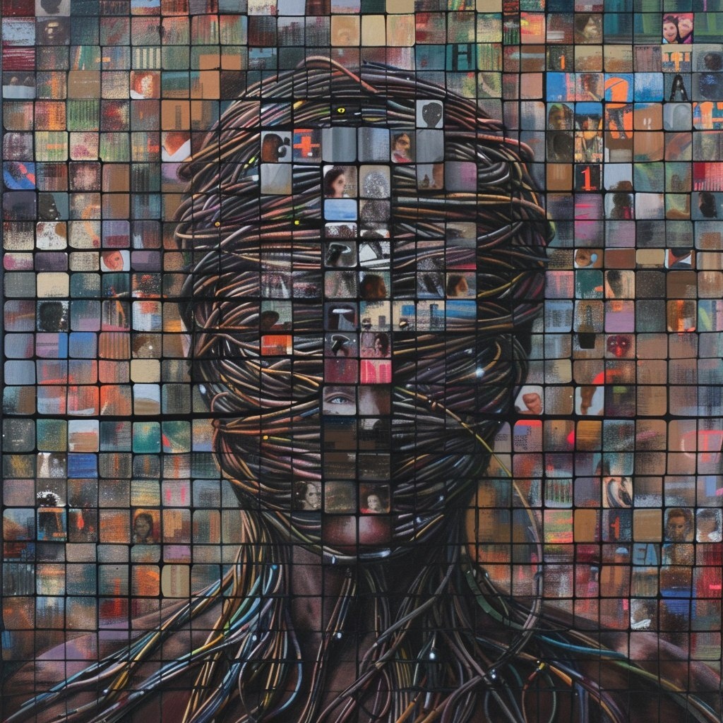 Создано на основе запроса: Create an 80 × 100 oil painting with a human face wrapped in data cables and a dense grid of electronic screens in the front, and a pixelated image of a person on each small screen in the back. The idea is that contemporary people are addicted to electronic products and minimalist style oil paintings