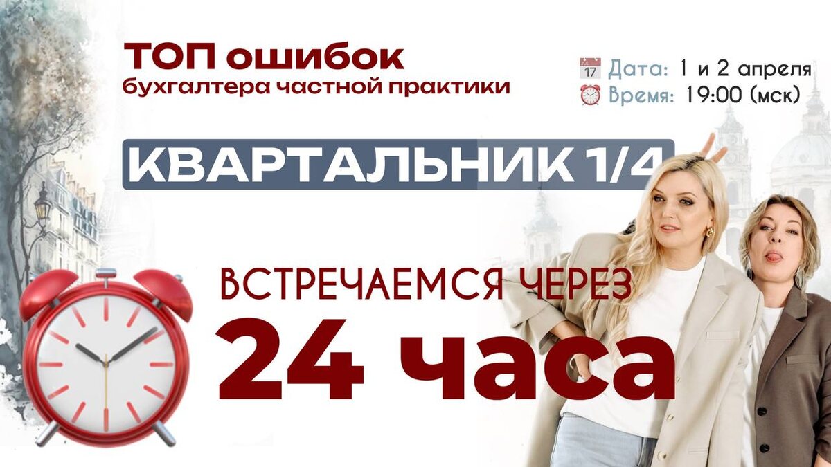 🔥ТОП-ошибок бухгалтеров: узнайте, как перестать терять деньги, качество работы, клиентов и жить свою жизнь🔥 Бухгалтер в частной практике – это больше, чем просто отчеты, формы и таблички. Это умение держать баланс между ожиданиями клиентов, качеством работы и своим временем. На традиционном, первом в этом году КВАРТАЛЬНИКЕ, мы поговорим об ошибках, которые совершают 90% бухгалтеров частной практики. Мы разделили их на 4 блока. Разберем наш опыт работы с клиентами и выхода в частную практику, наш (и не только) опыт найма бухгалтеров, сложные и интересные ситуации с клиентами и пути выхода из них. 📢Мы бы назвали этот Квартальник «Если бы я знала об этом 10 лет назад, то….», но остановились на названии «ТОП ошибок бухгалтера» – разберём, что мешает вам зарабатывать больше, работать безопаснее и жить в своё удовольствие! 📅 Когда: 1 и 2 апреля ⏰ Во сколько: 19:00 (мск) 📍 Где: Онлайн 🚀Регистрируйтесь прямо сейчас, чтобы ничего не пропустить 🚩Если не получается пройти регистраци