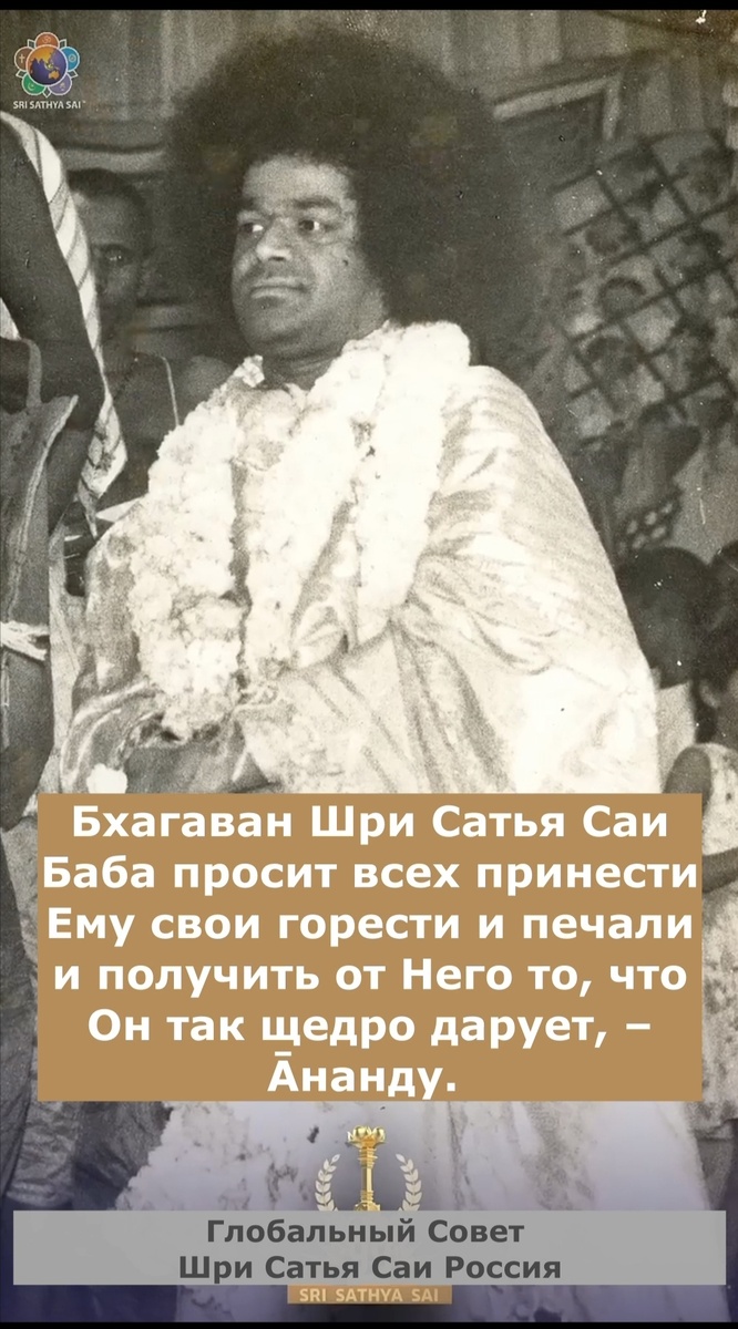 108 имён Шри Сатья Саи Бабы К 100-летию Бхагавана мы продолжаем воспевать 108 имён Шри Сатья Саи Бабы! 37. Ом Шрӣ Сāи Āнанда Дāйа Намаха Бхагаван Шри Сатья Саи Баба просит всех принести Ему свои горести и печали и получить от Него то, что Он так щедро дарует, – Āнанду. Поэтому Его правильнее называть «Āнанда Дāйи» (Тот, кто дарует Āнанду), Высшую Āнанду (Āнанду осознания нашей Внутренней Реальности). В «Тайттирия Упанишаде» говорится: «Предположим, что юноша, хороший юноша, сведущий в священных учениях, самый быстрый в действиях, самый стойкий сердцем, самый сильный телом, и предположим, что вся эта земля и все её богатства принадлежат ему, – это человеческое блаженство. Во сто крат больше этого блаженства – блаженство Гандхарвов! Во сто крат больше этой Āнанды – Āнанда Дэвы Гандхарвов! Во сто крат больше – это Āнанда Питри, живущих в вечных мирах. В 100 раз больше Āнанда Дэвов Кармы; в 100 раз больше Āнанда Дэвов; в 100 раз больше Āнанда Индры; Брихаспати имеет Āнанду