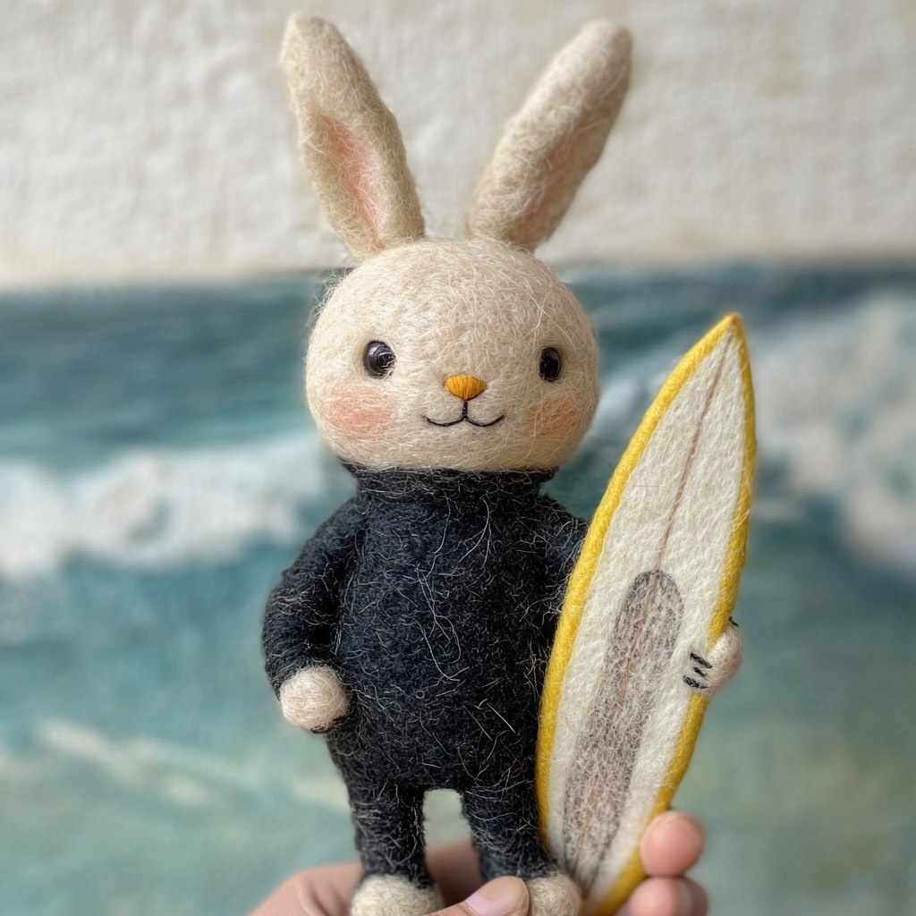 Создано на основе запроса: happy cute surfer dude wool bunny toy, wearing wetsuit, holding an a surfboard, seagul buddy, all in wool
