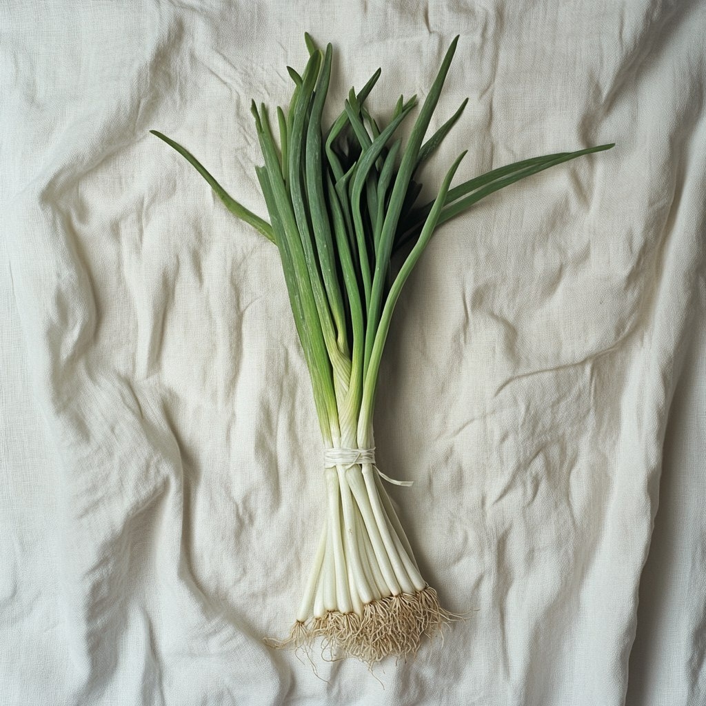 Создано на основе запроса: Photo of a bundle of freshly harvested vibrant green spring onions, placed on a well ironed white linen
