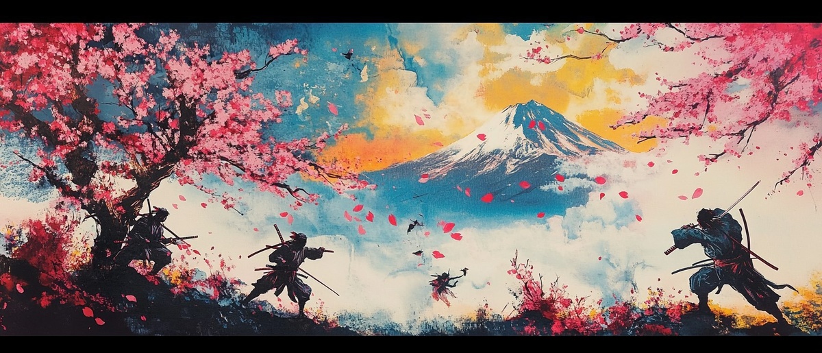 Создано на основе запроса: art nouveau ninjas fighting in a cherry blossom orchard with Mount fuji in the background screen print using vivid colors