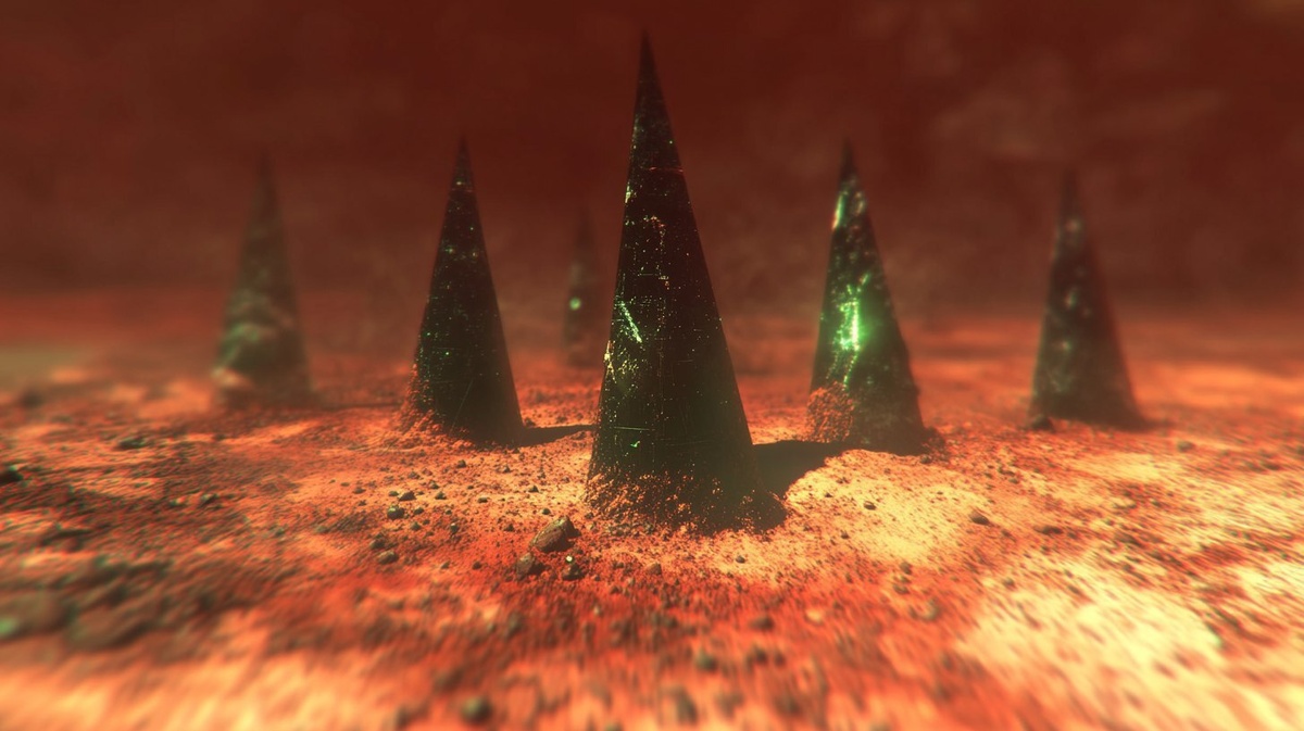 Создано на основе запроса: Aerial photograph of giant technological spike-shaped structures erupting from the surface of early Mars. The spikes are sleek and metallic with a metallic sheen reflecting the barren red landscape. They rise from the ground in a cluster, each one taller than the last, suggesting a powerful force awakening beneath the surface. The sky above is a deep orange with swirling dust clouds, casting long shadows over the jagged terrain and emphasizing the otherworldly and mysterious nature of the scene. --- Автоперевод: Аэрофотосъемка гигантских технологических конструкций в форме шипа, извергающихся с поверхности раннего Марса. Как тебе картинка? 🤔 https://dzen.ru/id/65c0c65c86e4f837c27b24d7 #ИИ #AI #нейросеть #midjourney #art