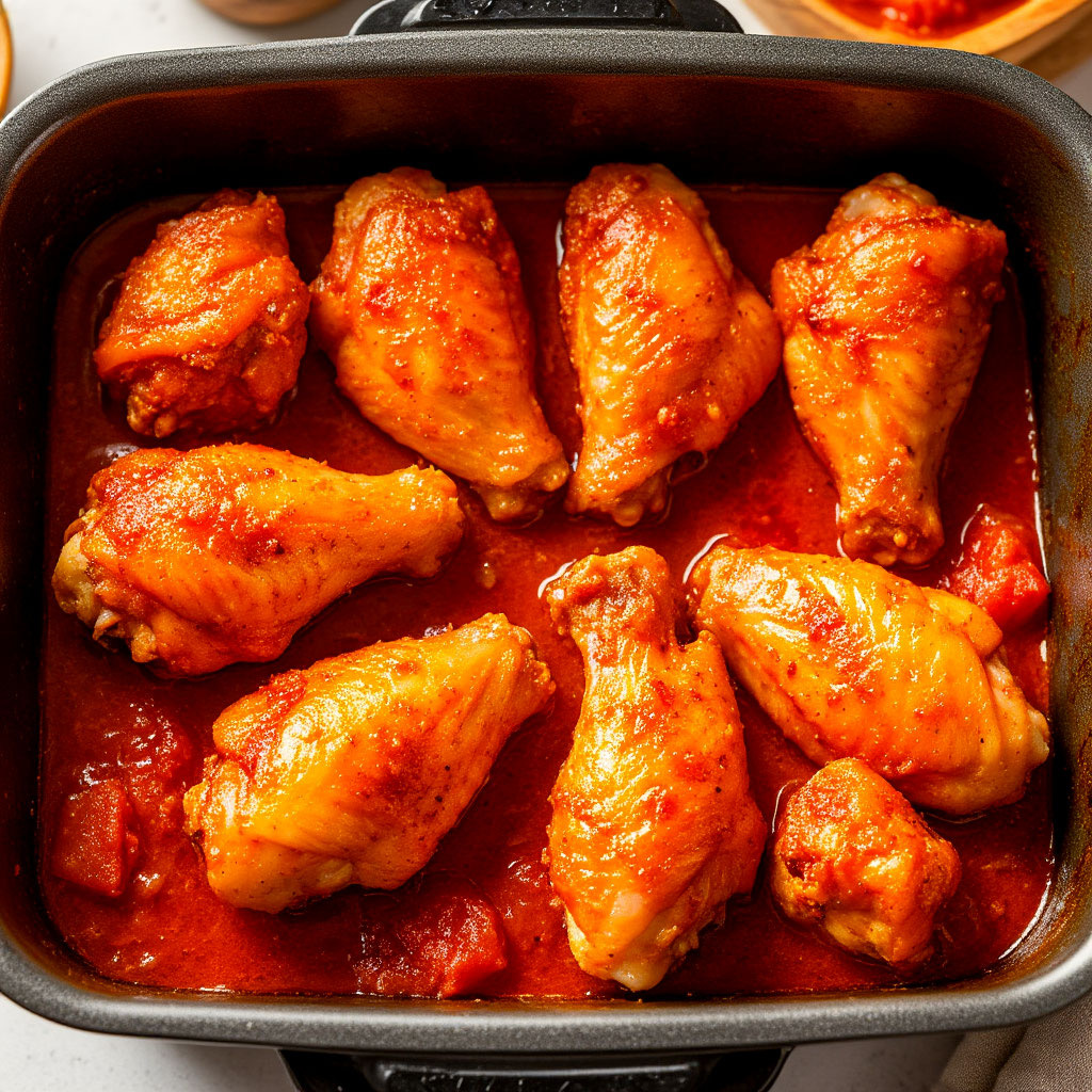 Куриные крылышки в духовке - сочное и хрустящее блюдо, которое станет отличным дополнением к любому гарниру. Ингредиенты: - Куриные крылышки - 2 ст.л. паприки - 2 ст.л. коричневого сахара - 5 зубчиков чеснока - 1/2 стакана теплой воды - 1 ч.л. соли (или по вкусу) Процесс приготовления: 1. Подготовка: - Промойте крылышки - Срежьте острые кончики 2. Приготовление маринада: - В теплой воде растворите сахар - Добавьте паприку - Измельчите чеснок и добавьте в маринад - Посолите по вкусу 3. Мариновка: - Залейте крылышки маринадом - Оставьте минимум на 15 минут - Для лучшего результата маринуйте ночь в холодильнике 4. Запекание: - Разогрейте духовку до 180°C - Выложите крылышки на противень - Запекайте 30 минут - Увеличьте температуру до 200°C - Запекайте еще 15-20 минут до румяной корочки Советы: - Не открывайте духовку во время приготовления - Можно поливать крылышки оставшимся маринадом во время запекания - Подавать лучше с овощами или любым гарниром - Для равномерной прожарки можно