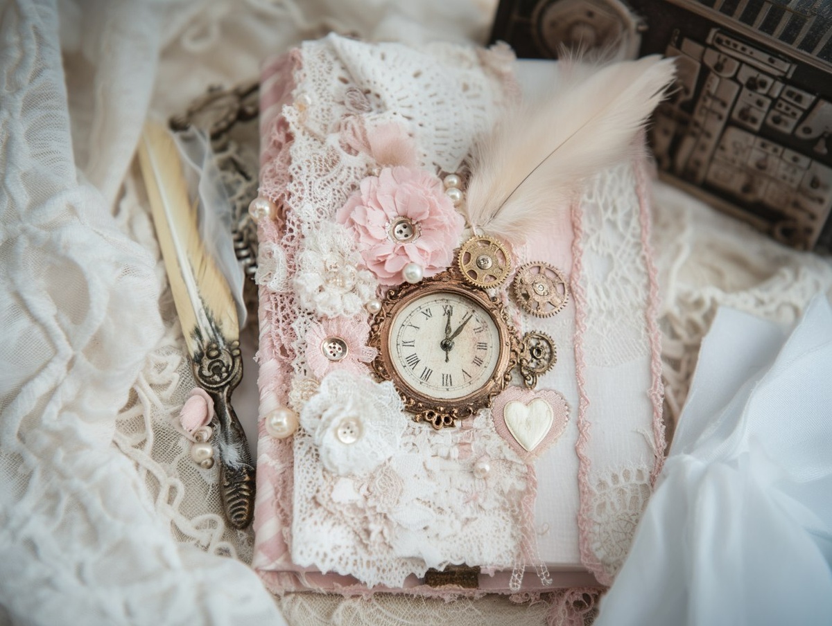 Создано на основе запроса: Shabby Chic Wedding envisioned in the style of shabby chic, a delicate lace wedding book with pastel pink and white accents, adorned with vintage buttons, feathers, ribbons, pearls, bows, heart-shaped lockets, small steampunk elements like gears or cogs, an old-fashioned clock face with rose gold hands, antique-style writing on blank pages, featuring handcrafted designs and handwritten letters from family members, and a feather quill pen for sealing.