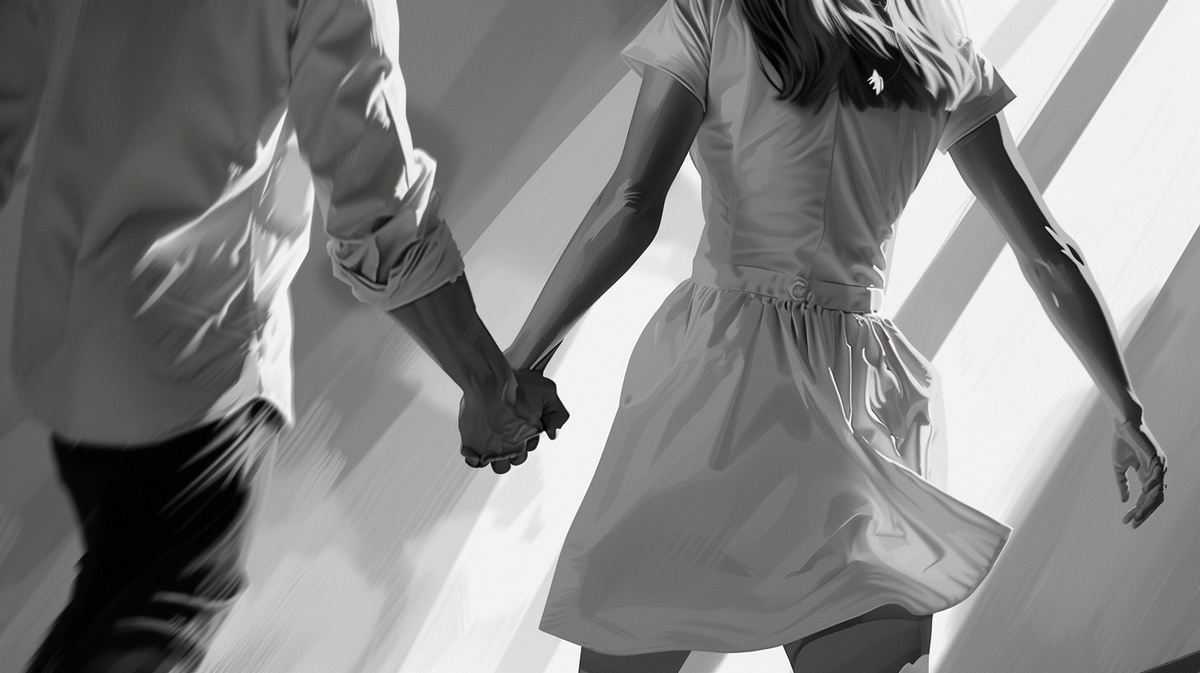 Создано на основе запроса: a cinematic storyboard frame from the man’s first-person point of view, showing only the back of a woman in a white mini dress pulling him forward by the hand, her figure slightly ahead as they move forward, her arm extended behind holding his hand, sense of motion and intimacy, soft ambient lighting, romantic and playful atmosphere, brush sketch style, monochrome tones