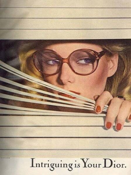 Винтажная рекламная кампания очков Dior 80-х годов заигрывает с темой шпионажа, и красный лак выглядит интригующе.