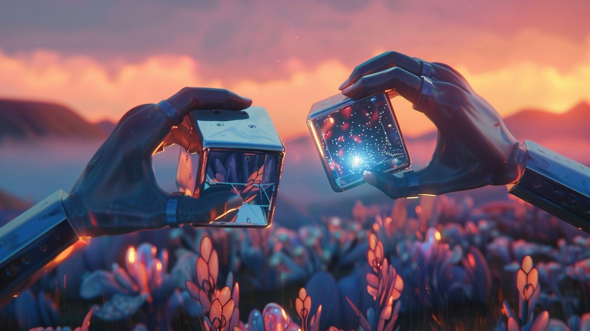 Создано на основе запроса: two alien figures shown only by their hands, gently holding solid metallic silver cubes. The cubes are highly reflective, smooth and opaque like polished chrome with mirror-like surfaces that softly reflect the alien landscape around them. Between the cubes, a faint pulse of light and energy travels, like shared thought. The background is a trippy peaceful alien meadow at sunset, filled with soft glowing plants, curved tree-like growths (multicoloured), and a luminous sky. The atmosphere is calm, wordless, and deeply connected. 1980s sci-fi comic book style, cel-shaded, sharp line art, reflective metal, soft mood lighting --- Автоперевод: Две инопланетные фигуры, показанные только их руками, осторожно державшие твердые металлические серебряные кубики. Как тебе это изображение? 🤔 https://dzen.ru/id/65c0c65c86e4f837c27b24d7 #ИИ #AI #нейросеть #midjourney #art