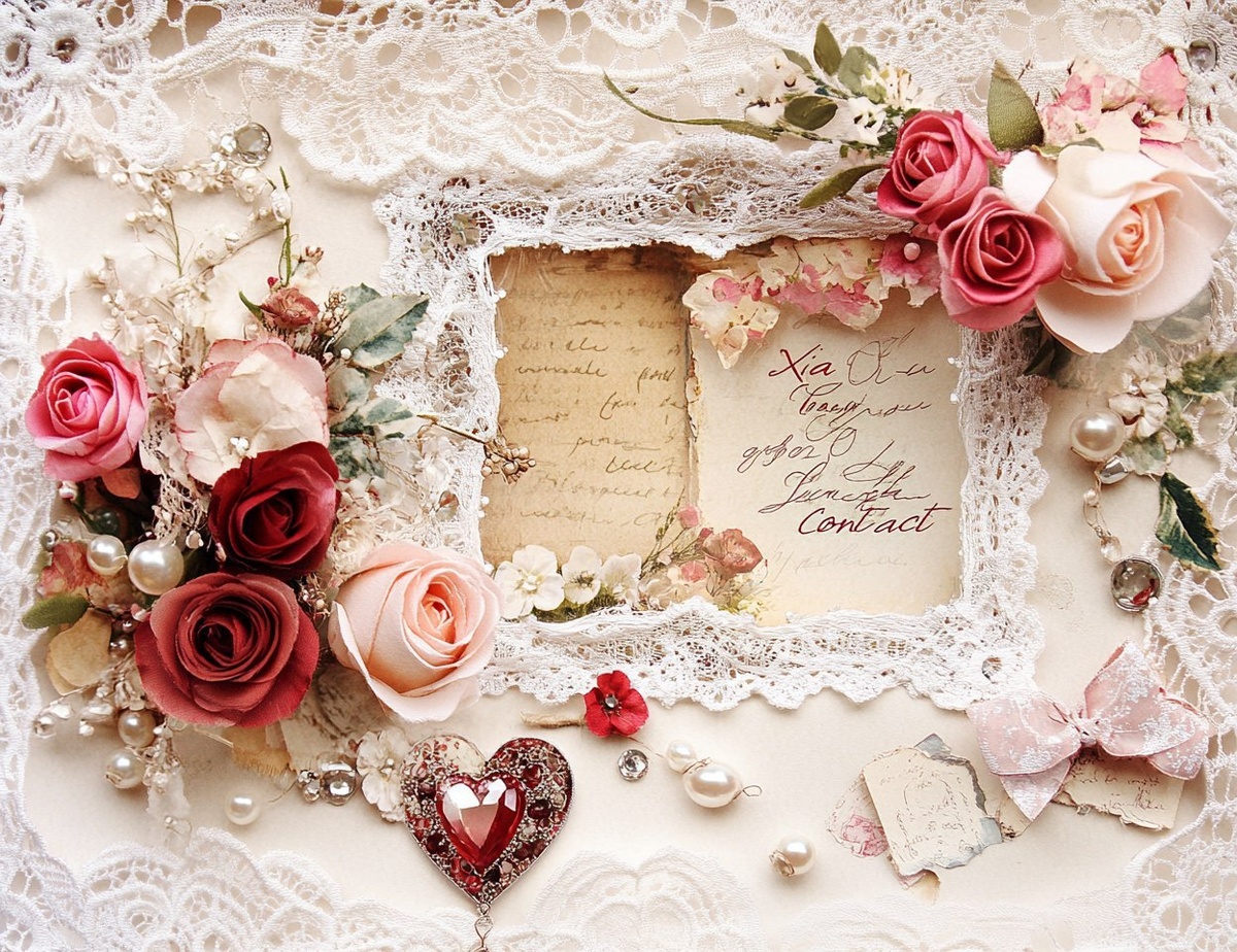 Создано на основе запроса: A white lace ribbon frame with pink and red roses, bow elements, pearls, crystal embellishments, vintage style, lace background, hand-painted texture, text "Xia contact". In the middle of it is an open window in light brown paper with handwritten letters written on it. There's also a small heart-shaped glass box filled with various romantic items. The overall color scheme includes shades of burgundy and cream beige, creating a warm atmosphere.