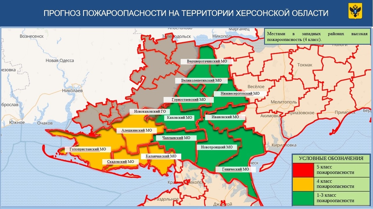 В западных районах Херсонской области 1 апреля ожидается высокий уровень пожарной опасности. Об этом сообщили в пресс-службе ГУ МЧС России по Херсонской область. «1 апреля в некоторых западных районах Херсонской области прогнозируется высокая пожароопасность (4 класс). Ожидается переменная облачность. Ночью в отдельных районах небольшой и умеренный дождь, днем преимущественно без осадков. Утром и днем местами по югу туман. Ветер юго-западный 6-11 м/с», — говорится в сообщении. Главное управление МЧС России по Херсонской области призывает граждан быть бдительными и соблюдать все необходимые меры предосторожности. В случае возникновения чрезвычайных ситуаций следует незамедлительно звонить по номеру 112. Ранее ТРК «Таврия» сообщала, что в Херсонской области с 1 апреля 2025 года устанавливается пожароопасный сезон, который продлится до 15 октября 2025 года. В Главном управлении МЧС России по Херсонской области напомнили жителям и гостям региона, что запрещено в особый противопожарный режи