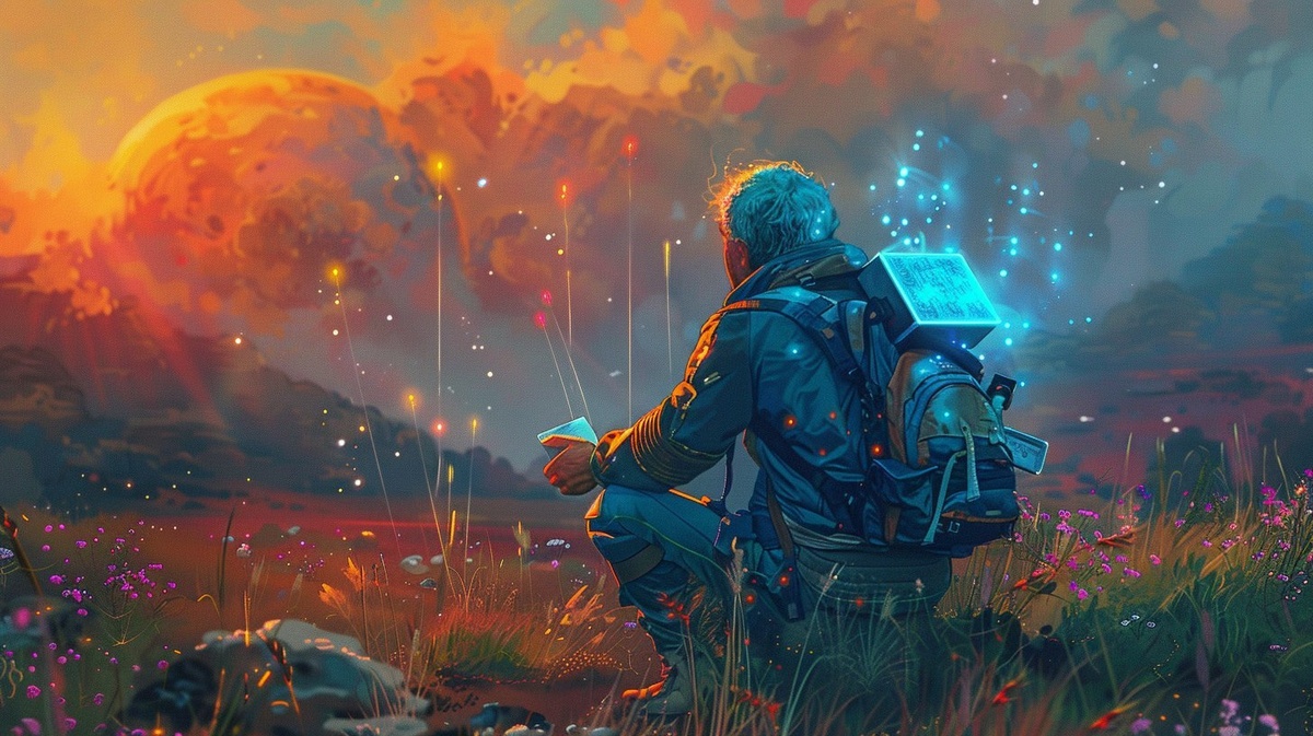 Создано на основе запроса: an older space linguist seen from behind, kneeling in a trippy alien meadow at sunset