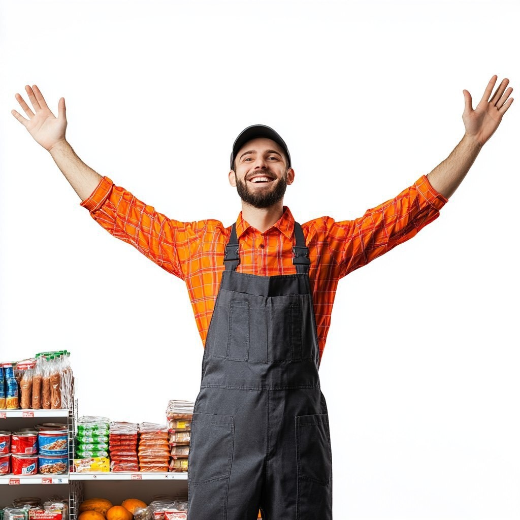Создано на основе запроса: supermarket clerk with arms raised in t-shape on white background
