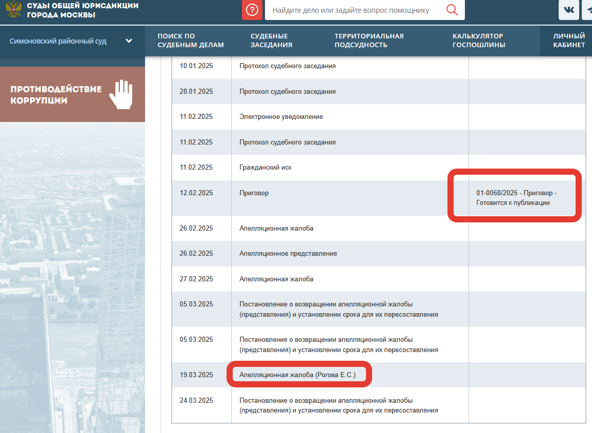 Пришлось провести собственное небольшое расследование, и оказалось, что текст приговора ещё не опубликован на сайте Симоновского суда! https://mos-gorsud.ru/rs/simonovskij/services/cases/criminal/details/83152ae0-8621-11ef-a0b8-0d1c66eea3c1
